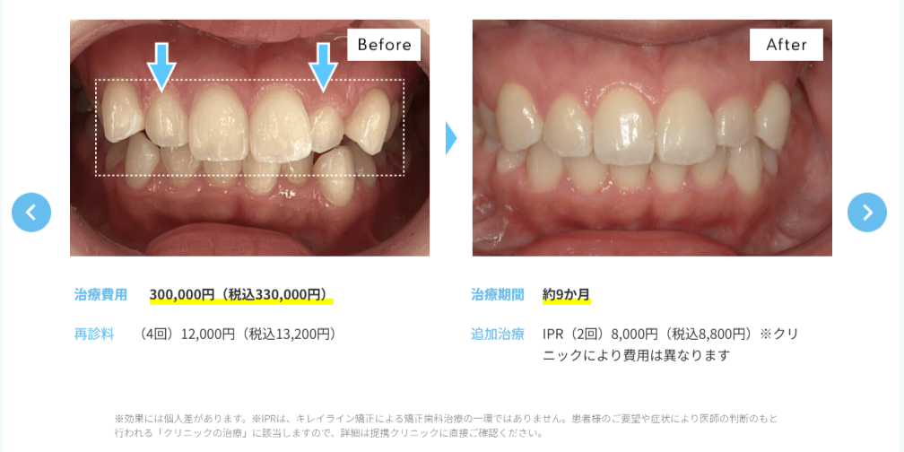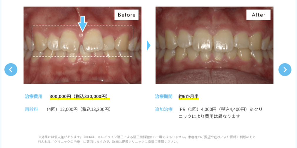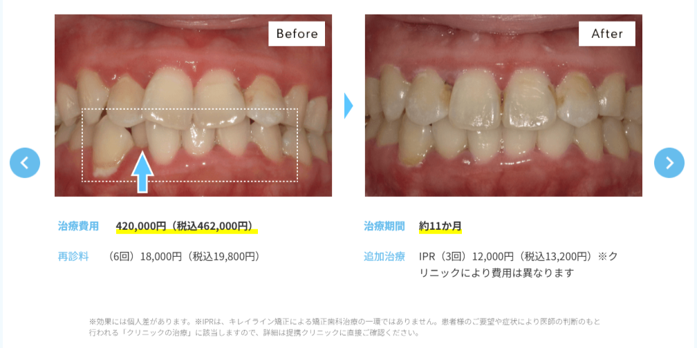 八重歯やすきっ歯など、動かす範囲が前歯部に限られるケース。このようなケースでは費用対効果が高く、「やってよかった」という満足度の高い口コミが多く見られます。 |
