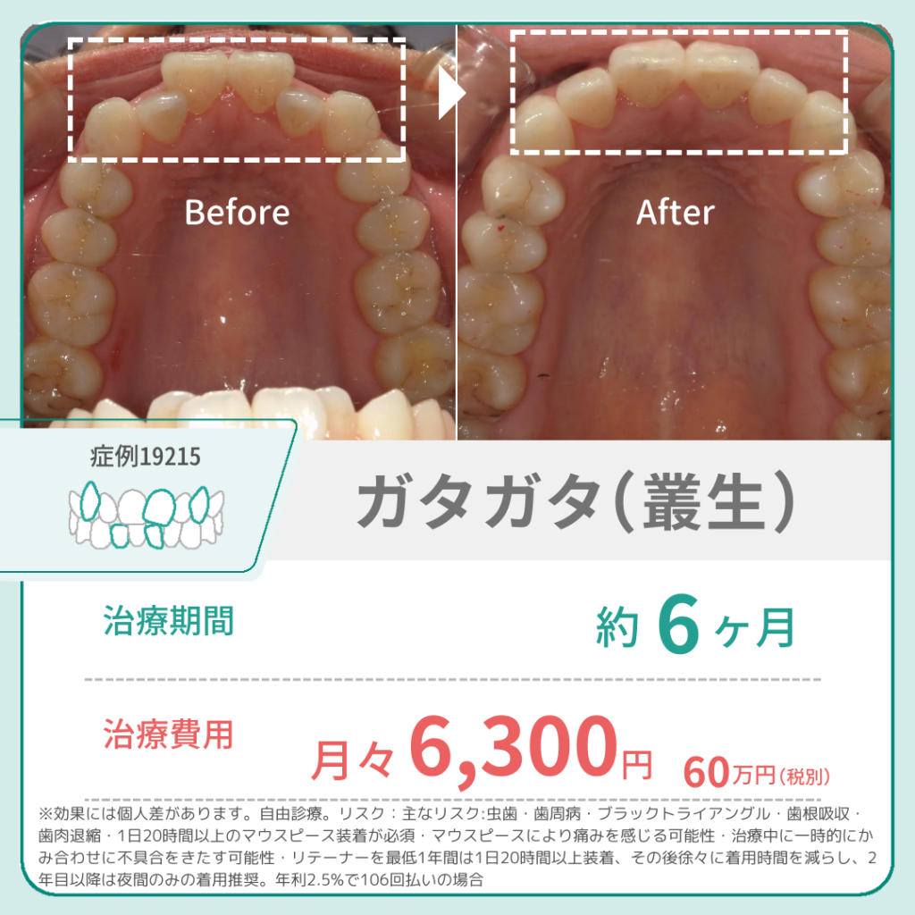 八重歯・軽いガタつき・すきっ歯など動かす範囲が限定的なケース。こうした部分矯正であれば短期間で見た目の変化が実感しやすく、費用対効果も高い。 |