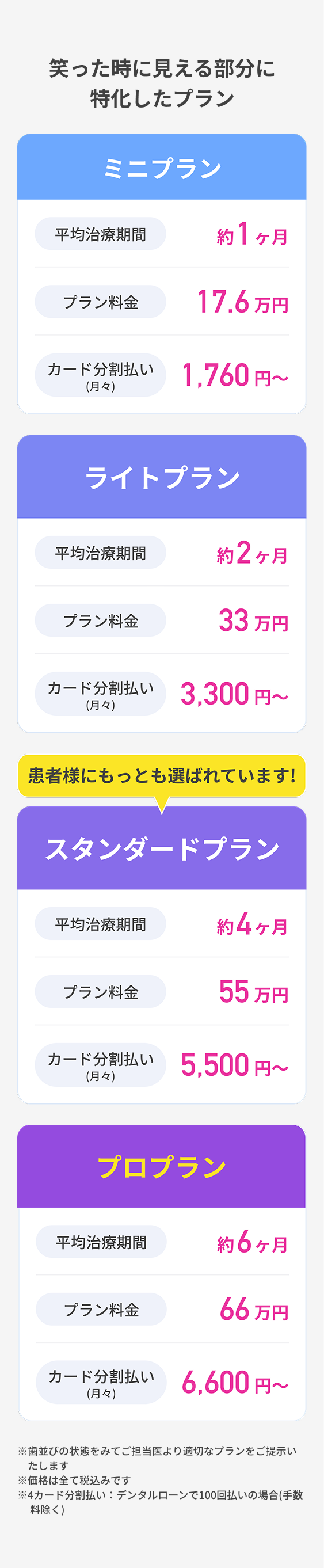 *1「月々の支払い 6,600 円」は、総額66万円(税込)の治療費をデンタルローンで支払う場合の分割料金となります(手数料を除く)*2「月々の支払い 3,000円」は、総額22万円(税込)の治療費をデンタルローンで支払う場合の分割料金となります(手数料を除く)